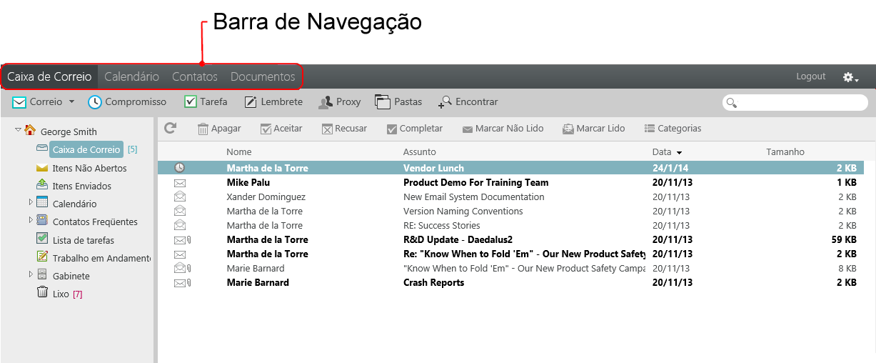 A Barra de Navegação está localizada na parte superior da página do WebAccess. Ela foi projetada para proporcionar um acesso rápido às pastas mais usadas. Por padrão, a barra de navegação contém as pastas Caixa de Correio, Calendário, Contatos e Documentos.
